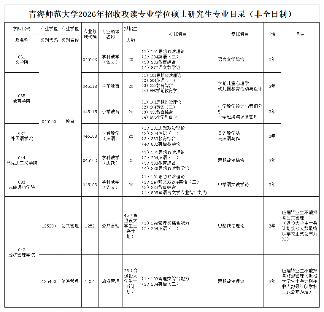 青海师范大学2026年招收攻读专业学位硕士研究生专业目录(非全日制)