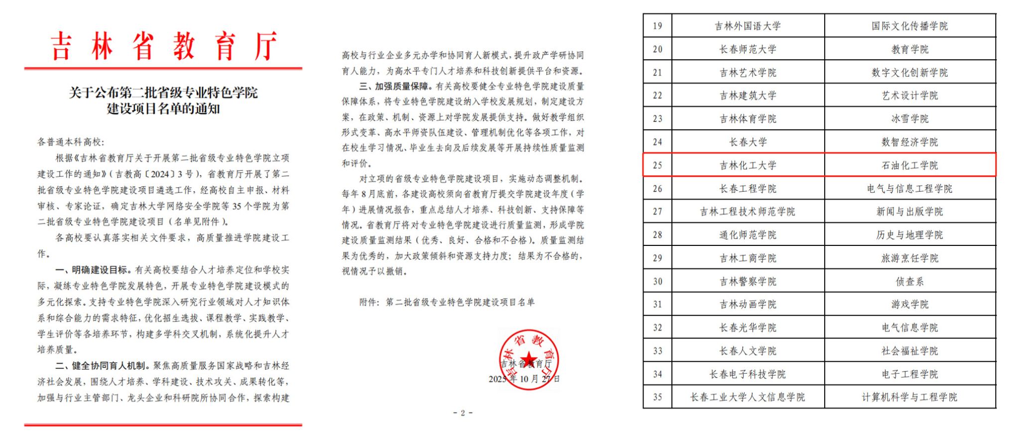 近日,吉林省教育厅发布了《关于公布第二批省级专业特色学院建设项目名单的通知》,我校石油化工学院凭借鲜明的化工优势和办学特色成功获批。